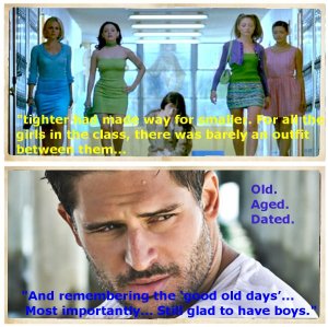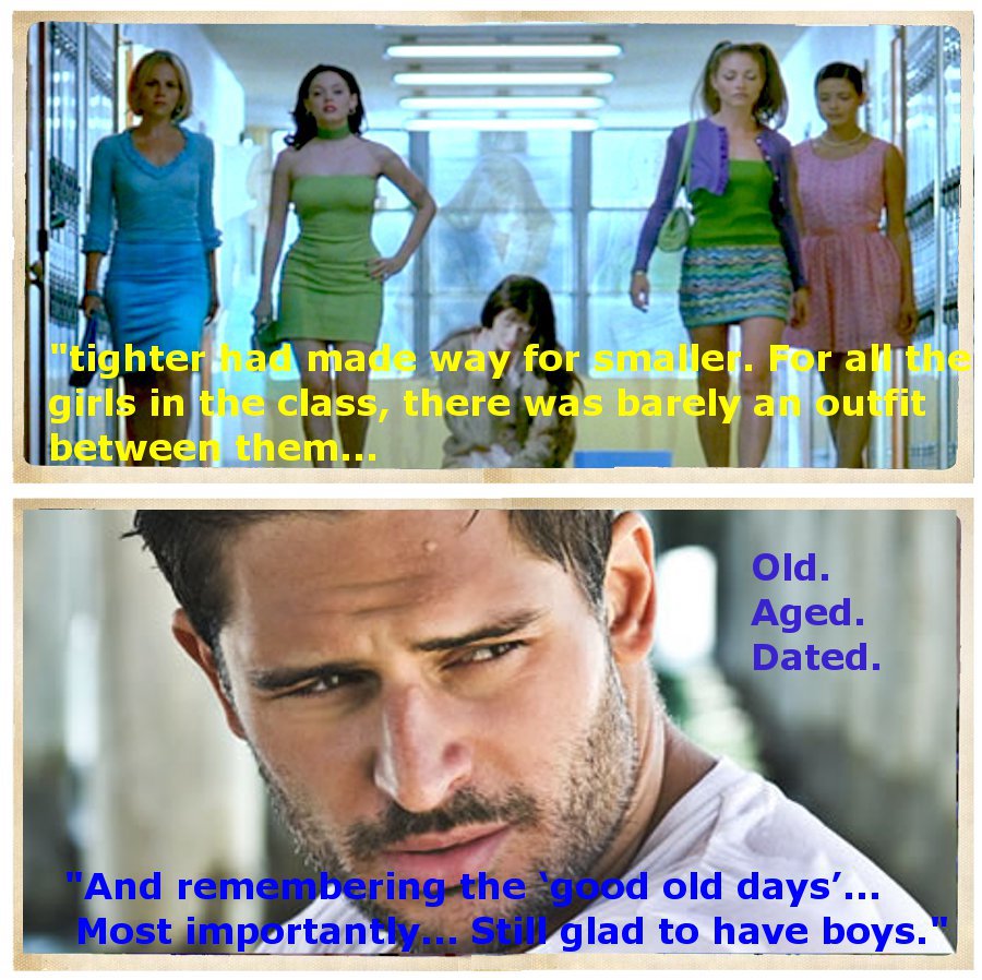 Nowadays it was scary… tighter had made way for smaller. For all the girls in the class, there was barely a whole outfit between them… Keds were a memory and high heels were the majority over anything close to modest or comfortable… I can’t remember the last time I’d seen so many bra straps in one place and if it was summer, I might be able to understand all the tank tops… but it was November for fuck sake… I was dying to see the dress code…