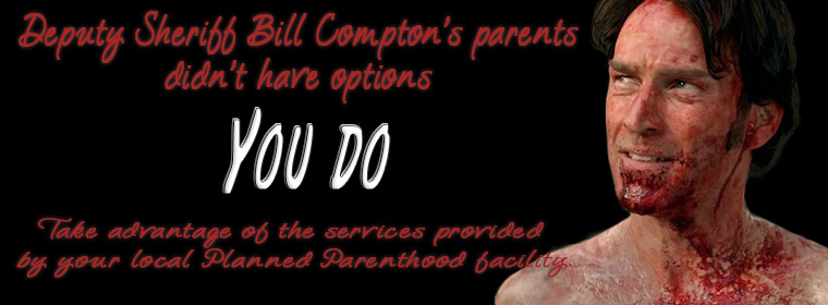 Klaasje corrected, “A billboard, using Compton’s likeness. It says, ‘Deputy Sheriff Bill Compton’s parents didn’t have options. You do. Take advantage of the services provided by your local Planned Parenthood facility.’ Compton’s address is included and…”