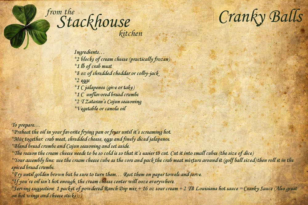 17. Since reading Saints and Sinners I have been dreaming of the poppers. Is there any way you could put that recipe up. I’m also excited to be trying the cranky balls this weekend